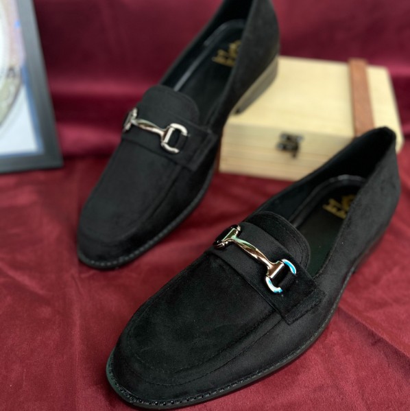 Black suede shoe topped with a buckle making it a go to shoe to all your last moment parties.